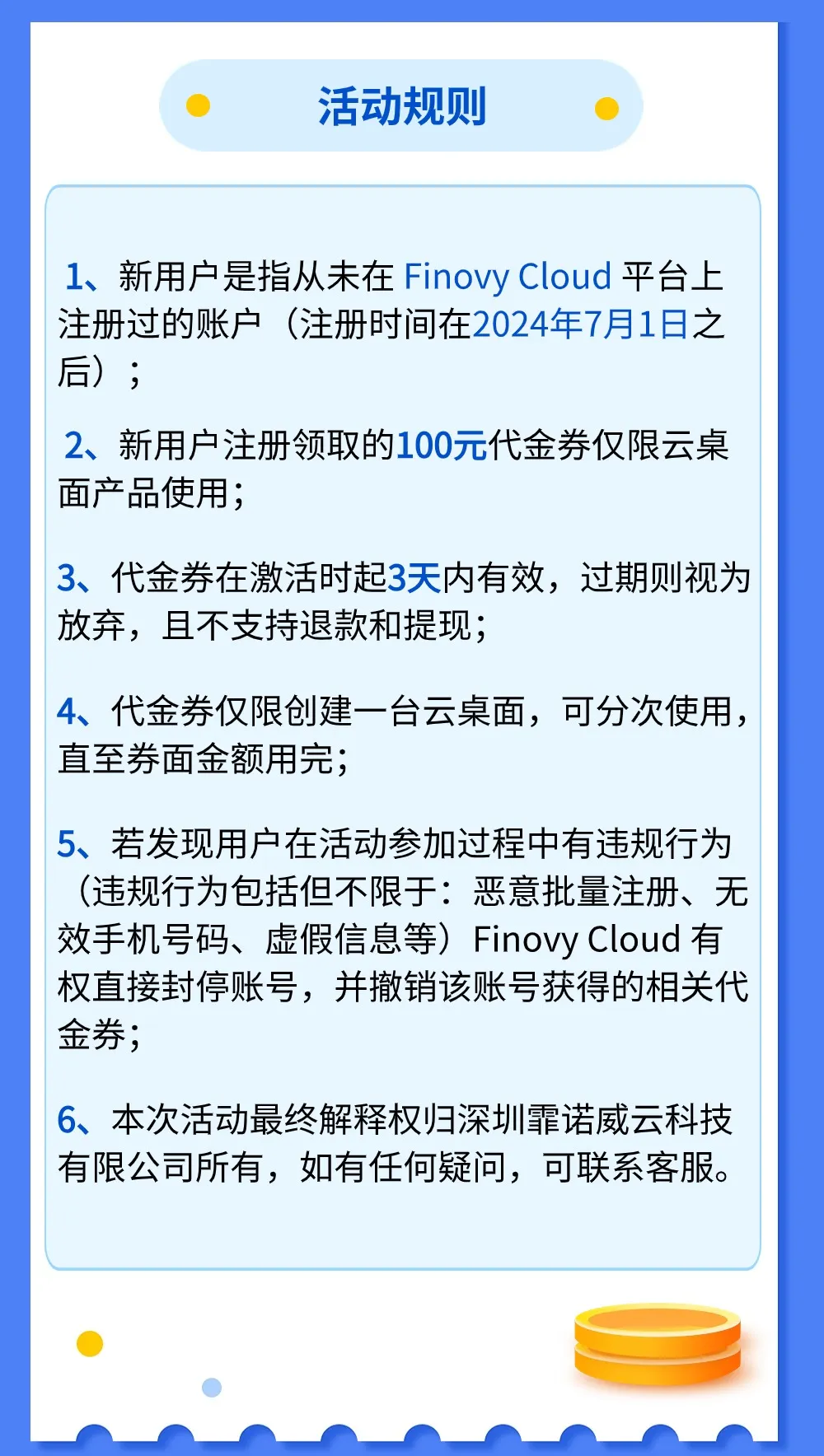 为了优化产品线,渲大师的“云主机”产品服务进行了下线迁移,并在新平台“Finovy Cloud”给大家带来了全新的、更加高效、稳定的云服务。 我们新平台 Finovy Cloud 继续给大家带来惊喜!7月1日,Finovy Cloud云桌面全新上线,新用户免费体验!活动具体内容如下:
